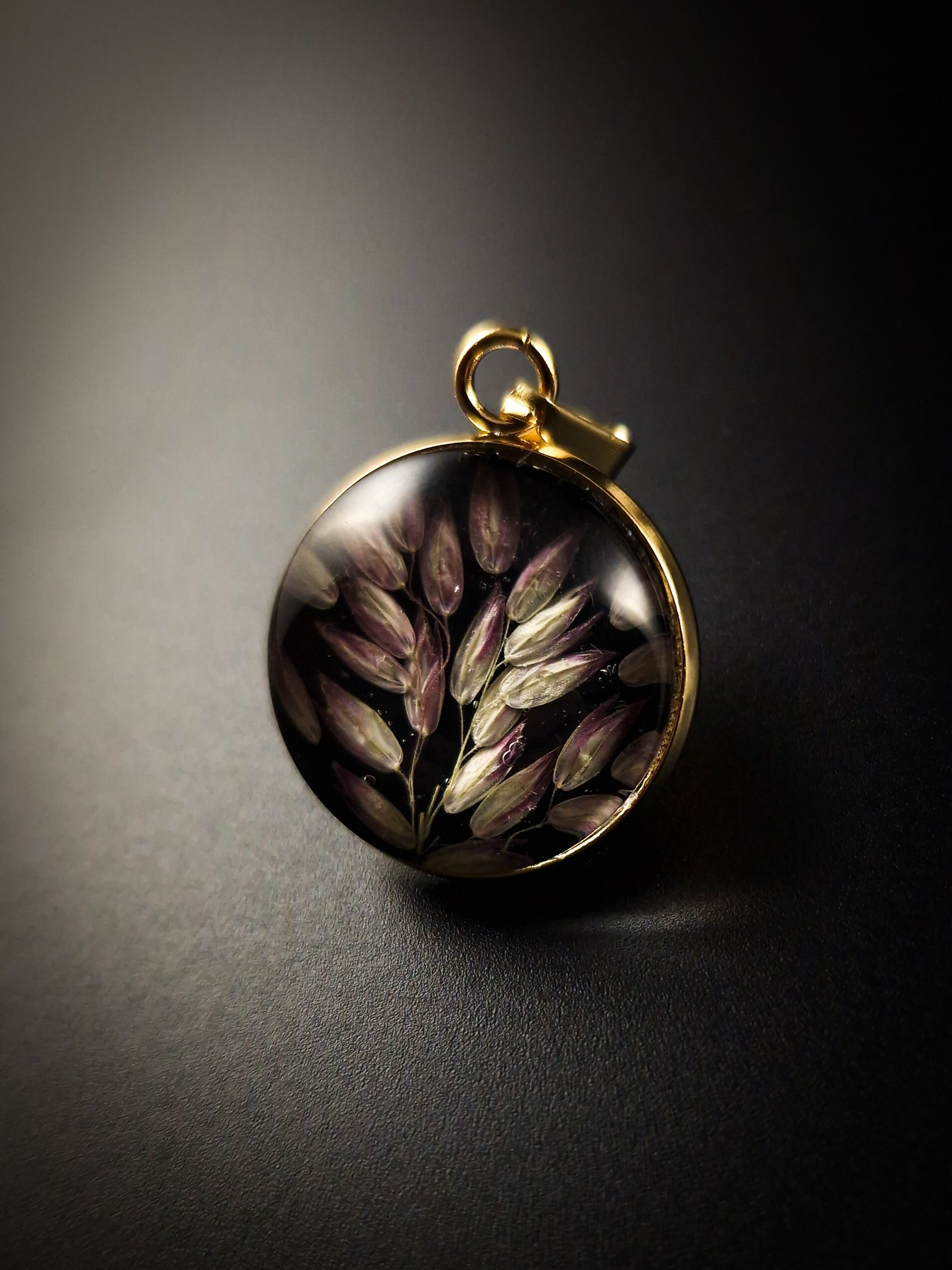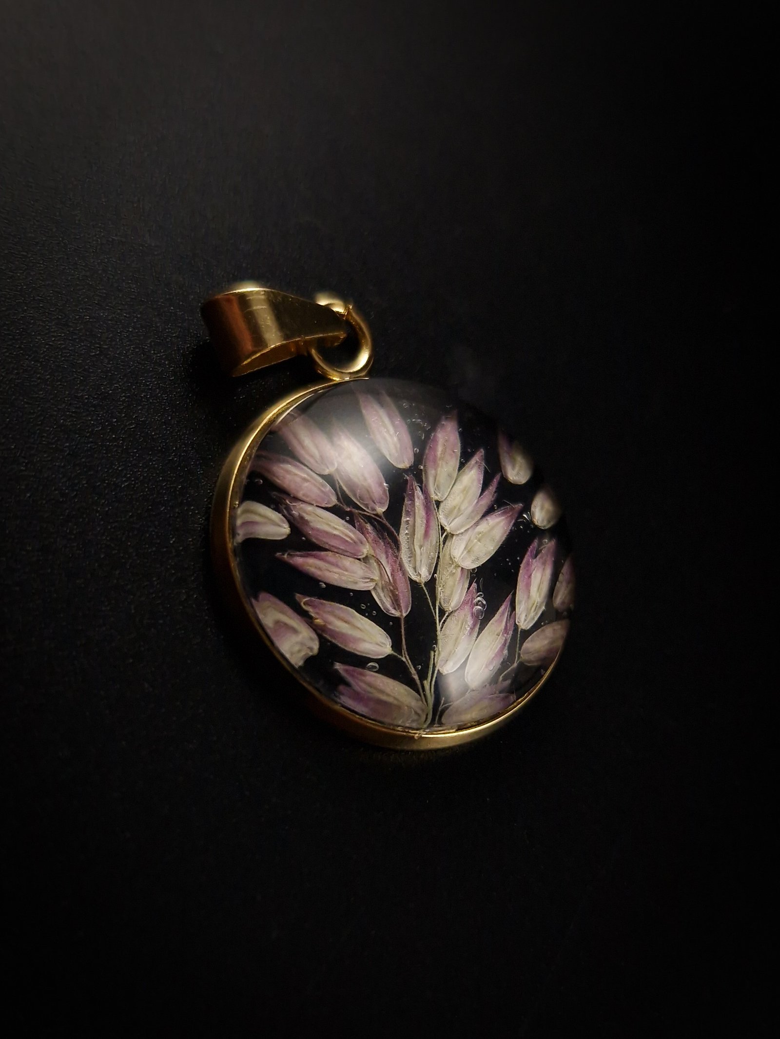 Da jedes Blatt und jede Blüte in der Natur einzigartig erschaffen ist, ist auch kein Medaillon wie der andere. Wenn du ein ganz bestimmtes Stück im Auge hast, schreib mir gerne! Ansonsten wähle ich ein besonderes Medaillon für dich aus – mit Grasblüten, in einer vergoldeten (18k) Edelstahlfassung mit einem Durchmesser von 16 mm.